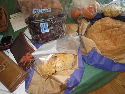 Then I rode down to Great Harvest for a loaf of Red, White and Blueberry bread and a loaf of Honey Whole wheat. And a free Vanilla Pecan scone. Then I rode to Rochester Produce for some cherries and apricots. They're delicious too! So this is all the stuff I had in my backpack on the last leg of my morning journey. It was pretty heavy.