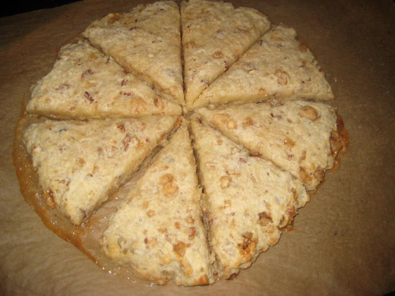 I instigated a little surprise birthday party for tomorrow morning for a runner that many of us know and love. I just make some scones to bring along. They didn't get nice and puffy this time for some reason. But they'll probably taste OK. They're butter pecan.